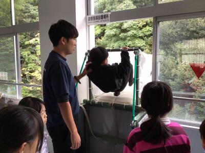 4年生では毎年、救助袋で避難する体験を行っています。