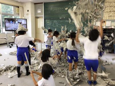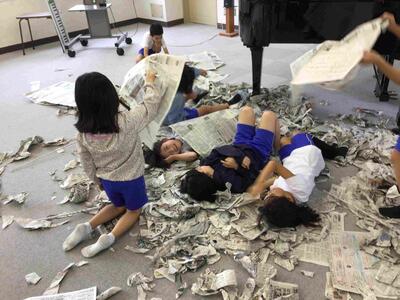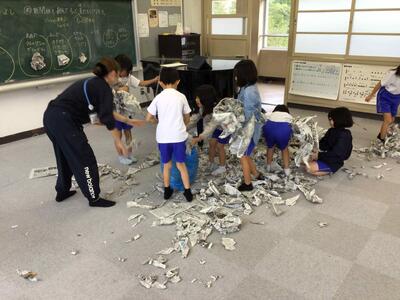 2年生の図画工作科では、新聞紙に体全体で関わり、破る、丸める、ねじる、折るなどの活動を通して、自分の見方や感じ方を広げる学習をしています。