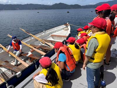 2人で声をかけ合って力を合わせて櫂を漕ぎ、全員の力で船を動かします。