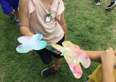 その後、できたカードをちょうちょの形に切り取って、中庭で飛ばせてみました。