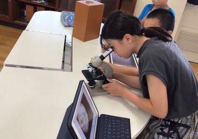 理科の授業で、顕微鏡を使ってヘチマの花粉を観察しました。
