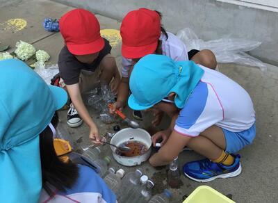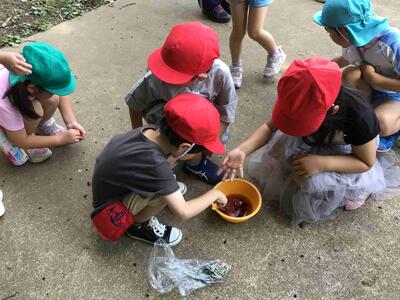 色水に使えそうな花や木の実を見つけ、すりつぶしたり水に混ぜたりして、色水を作って遊びました。