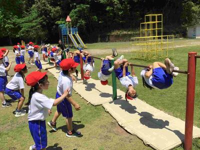 今日は、担任のかけ声に合わせて、「ぶたの丸焼き」や「こうもり」の技に次々と取り組んでいました。