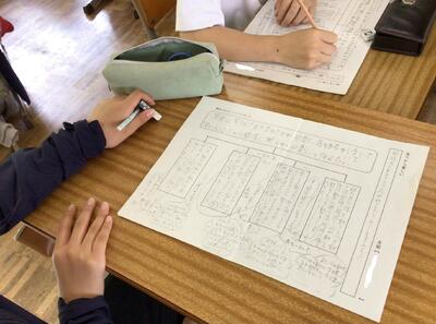 今日はワークシートに段落ごとの要点をまとめ、自分が気付いたことや分かったことを吹き出しの中に書き込みました。集中して取り組み、筆者との対話、自分自身との対話がしっかりとできた1時間でした。