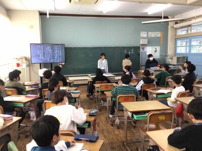 校長からは『くれよんのくろくん』の絵本をもとに、それぞれの個性を認め合うことや、思いやりの心を大切にすることなどを話しました。また、人権教育担当教員から、「みんなが幸せになるイスってなあに?」というクイズを出し、これからの人権月間の見通しを持てるようにしました。