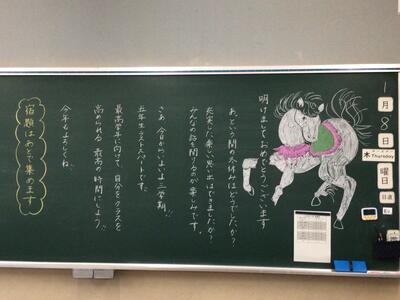 1/8 第3学期始業式 投稿: 学校管理者 (15:12) カテゴリー: 今日の出来事 冬休みが終わり、今日から3学期がスタートしました。 2026年は午(うま)年で、「前進」「飛躍」「挑戦」などの前向きな意味が込められているそうです。 今年も失敗を恐れず、自分の力を信じて、様々なことに挑戦できるような一年にしてほしいものです。 教室では、黒板に担任からのメッセージが。3学期も頑張ろうという気持ちになりますね。 それぞれの学級で、3学期のめあてを立てたり、冬休みの宿題を集めたり・・・。子どもたちの元気な声が、校舎内に響いていました。 Tweet -